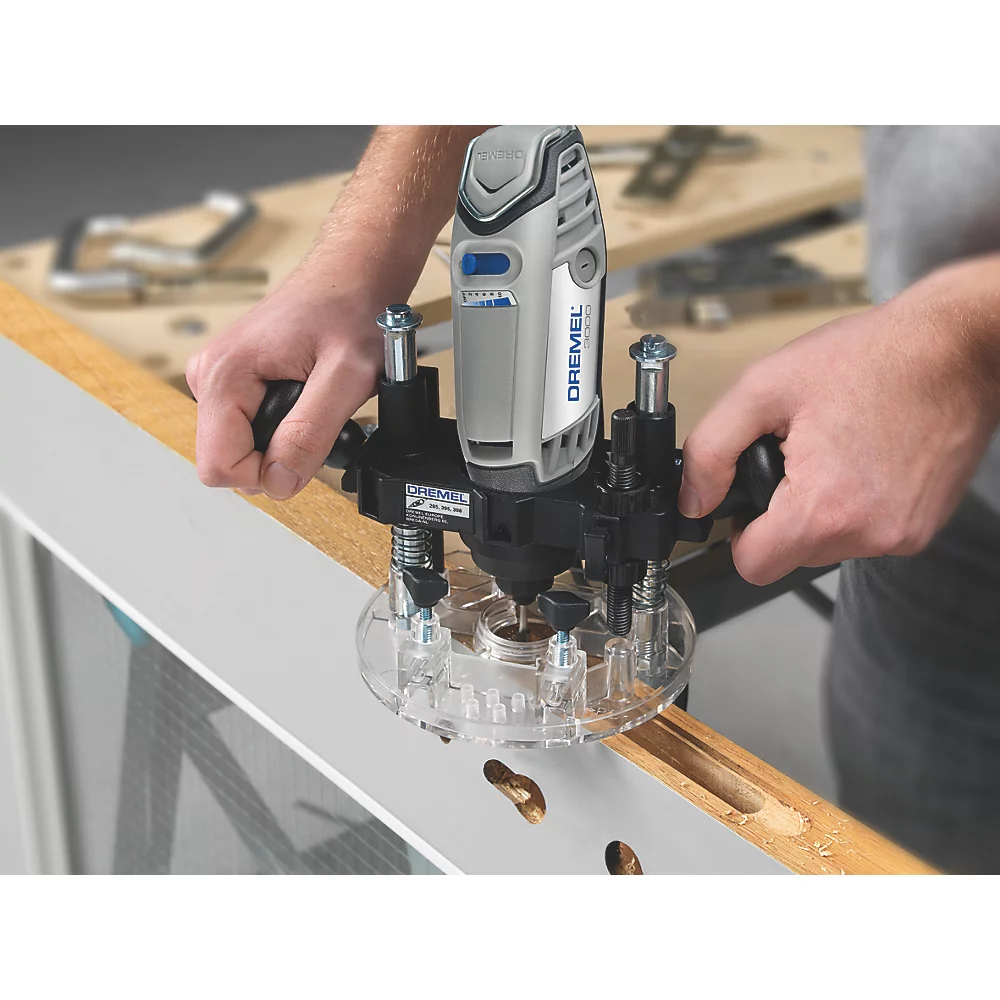 Convertit un outil rotatif Dremel filaire en mini-fraise à plongée. Coupe des bords décoratifs, les fentes droites ou découpe à main levée. La fonction de plongée vous permet de commencer au milieu de la pièce. Idéal pour la fabrication d’incrustations dans les meubles, les instruments de musique et l’artisanat du bois. Poignée de verrouillage en plongée pour un verrouillage en plongée rapide et facile. Deux butées de profondeur avec relâchement rapide pour un réglage rapide de la profondeur de fraisage. La base transparente permet une meilleure visibilité de la surface de travail. Le guide de profondeur comprend des marquages en unités anglaises et métriques. Stockage intégré pour les embouts de la fraise à toupiller et une clé.