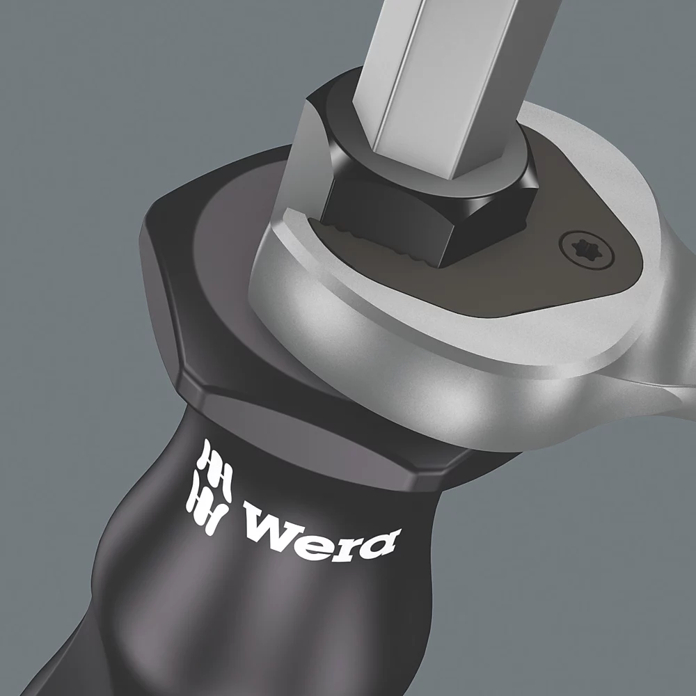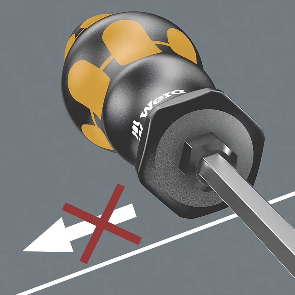 Assortiment de tournevis burins Kraftform Plus Wera, pour fixer, buriner et desserrer des vis grippées. Lame « Pound-thru » hexagonale conçue pour les conditions de travail difficiles. Fabrication dans un matériau pour embout de grande qualité, qui s’étend dans le manche, pour garantir un transfert total de la force. L’embout de frappe intégré et le matériau trempé ductile dans le manche permettent d’augmenter considérablement la durée de vie, de limiter les risques d’éclatement et d’absorber les vibrations. Il est également possible de transférer davantage de couple en fixant une clé à œil ou à fourche sur le collet hexagonal intégré. Le manche Kraftform Plus est conçu pour s’adapter parfaitement à la main et permettre ainsi un vissage rapide, confortable et ergonomique. Les zones dures du manche glissent dans la main, pour des vitesses élevées, tandis que les zones souples offrent une adhérence garantissant un transfert de couple élevé et un confort optimal en cas d’utilisation intensive. La forme hexagonale antiroulis empêche tout roulement non souhaité. La pointe Black Point Wera bénéficie d’un processus de durcissement de pointe pour garantir une grande longévité. La pointe également affiche une meilleure protection contre la corrosion et un maintien parfait dans la tête de vis.