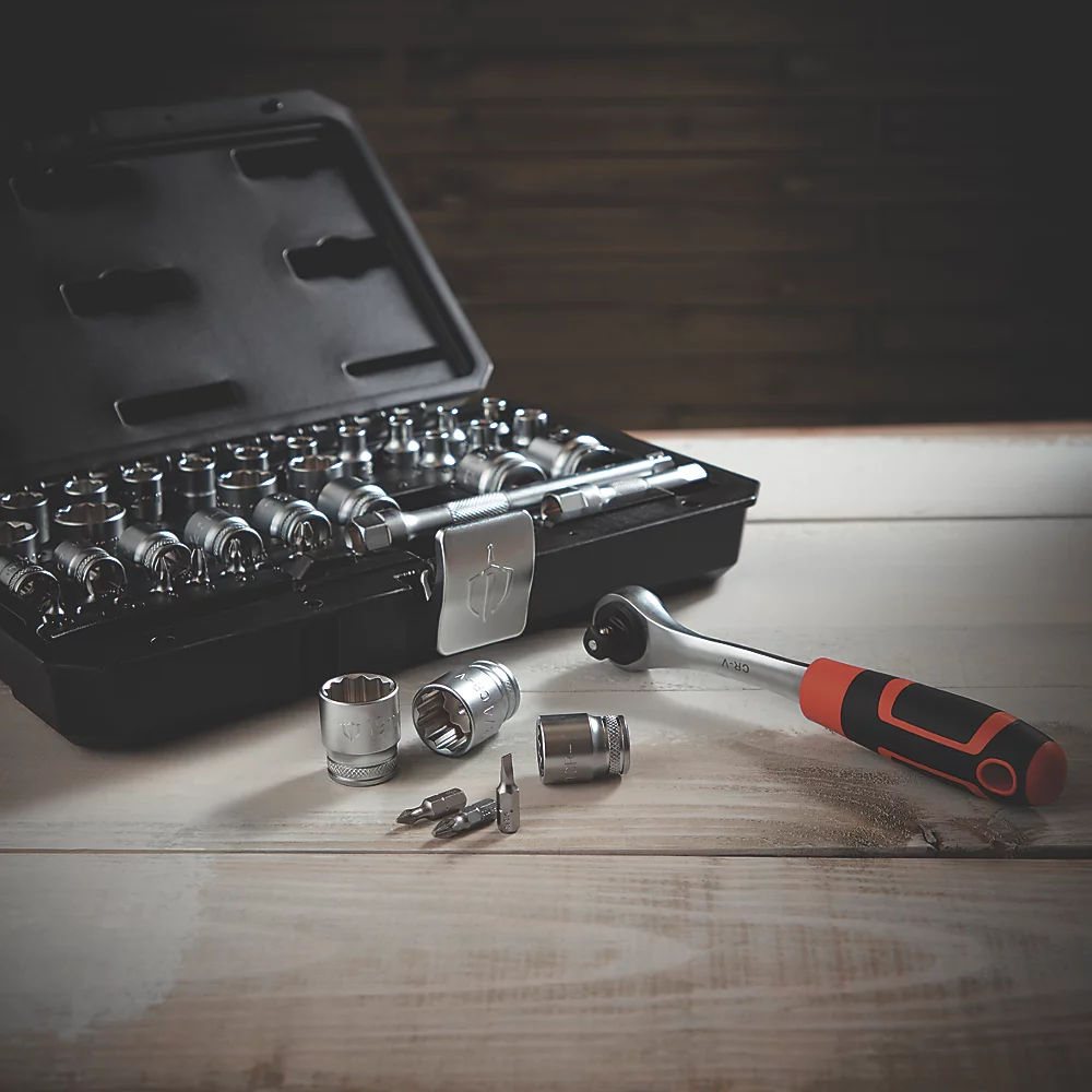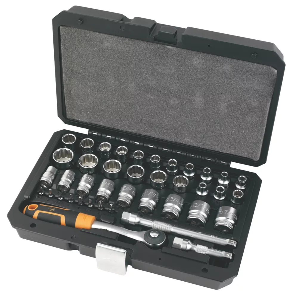 | Contenu | 16 douilles 12 points 3/8" (6, 7, 8, 9, 10, 11, 12, 13, 14, 15, 16, 17, 18, 19, 21 et 22mm), 12 douilles SAE 3/8" (¼, 5/16, 3/8, 7/16, 1/2, 9/16, 19/32, 5/8, 11/16, 3/4, 13/16 et 7/8"), clé à cliquet 3/8", 2 rallonges 75-150mm, raccord 3/8" 8-25mm x ¼", 3 embouts de tournevis Phillips (PH1, PH2 et PH3), 3 PZ (PZ1, PZ2 et PZ3) et 2 plats (3 et 4mm). |