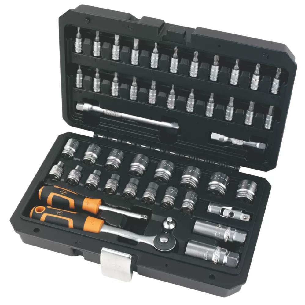 Pour serrer et desserrer des boulons ou des vis lors de l’entretien de véhicules et pour un usage domestique. En acier à outils au chrome-vanadium trempé et meulé avec précision, pour une résistance et une durabilité accrues. Douilles moletées pour une meilleure prise en main et 12 points de contact. Clé à cliquet ergonomique avec manche bi-matière antidérapant pour un confort et un maintien optimaux. Dans une mallette de transport.