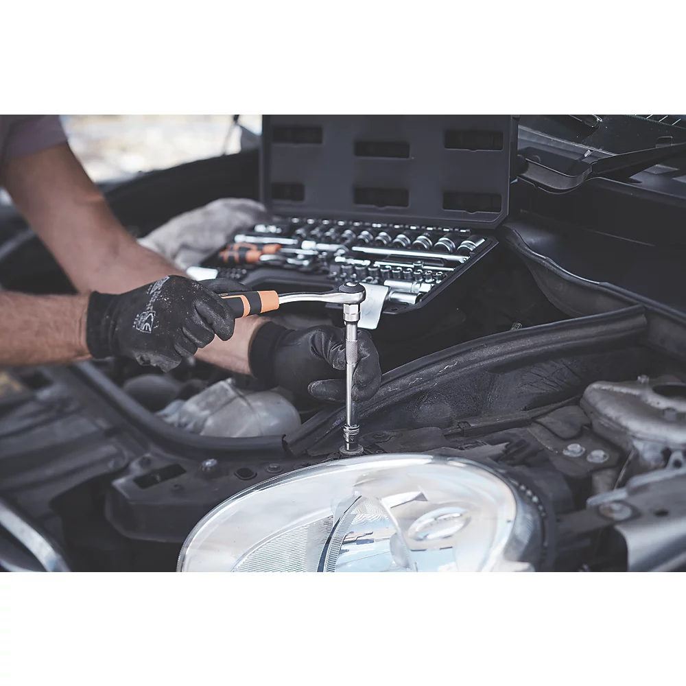 | Contenu | 12 douilles 6 points ¼" (4, 4,5, 5, 5,5, 6, 7, 8, 9, 10, 11, 12 et 13mm), 11 douilles 12 points 3/8" (10, 11, 12, 13, 14, 15, 16, 17, 19, 21 et 22mm), 2 rallonges ¼" en acier (2" et 4"), barre coulissante ¼", cardan ¼", clé à cliquet 72 dents ¼" 150mm, manche rotatif ¼", cardan 3/8", clé à cliquet 72 dents 3/8" 192mm, 2 rallonges 3/8" (6" et 10"), 2 douilles à bougies 3/8" (16 et 21mm), raccord ¼", 30 embouts (25mm x ¼") et adaptateur triple 3/8" mâle x ½" femelle. |
