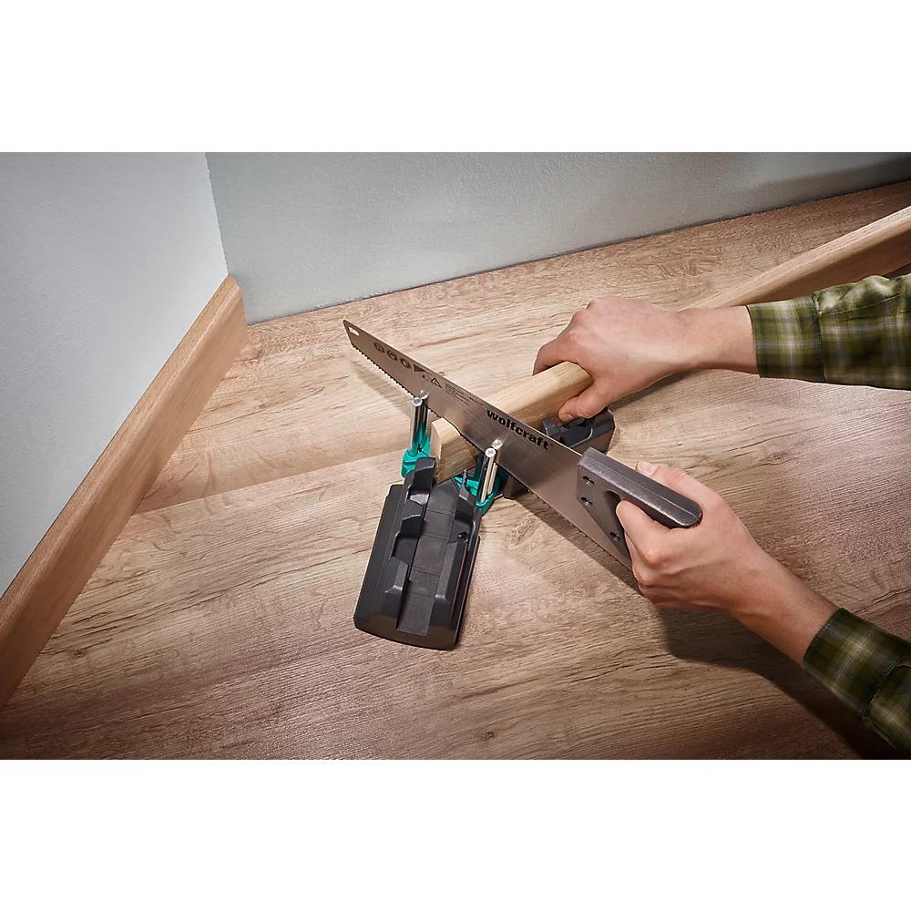 Cette fausse équerre et boîte à onglet pour une mesure et un sciage précis des onglets précis est un outil 2-en-1 intelligent qui garantit un montage parfait des plinthes et rend superflue l’utilisation d’un outil de coupe en biseau. Elle élimine la perte de temps et les erreurs fréquentes lors du transfert de l’angle à la scie. Les 2 bras flexibles permettent de mesurer en toute simplicité des angles de 85 à 180°. L’étape suivante consiste à simplement placer la plinthe dans les guides fournis et à la couper à l’aide d’une scie à onglet. La bissectrice automatique des 2 broches de guidage garantit des onglets précis. La boîte à onglet et à biseau permet d’effectuer des transitions de plinthe parfaites, même dans les coins des anciens bâtiments penchés.