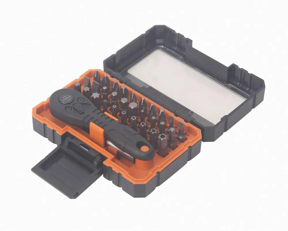 | Contenu | 30 embouts 25 mm : Philips PH1, 2 PH2, PH3, plats 3 mm, 4 mm, 5 mm, 6 mm, Pozidriv PZ1, 2 PZ2, PZ3, hexagonaux 3 mm, 4 mm, 5 mm, 6 mm, Torx T10, T15, T20, T25, T27, T30, T40, T10H, T15H, T20H, T25H, T27H, T30H, T40H (Tamper Torx), porte-embouts magnétique à libération rapide et clé à cliquet |