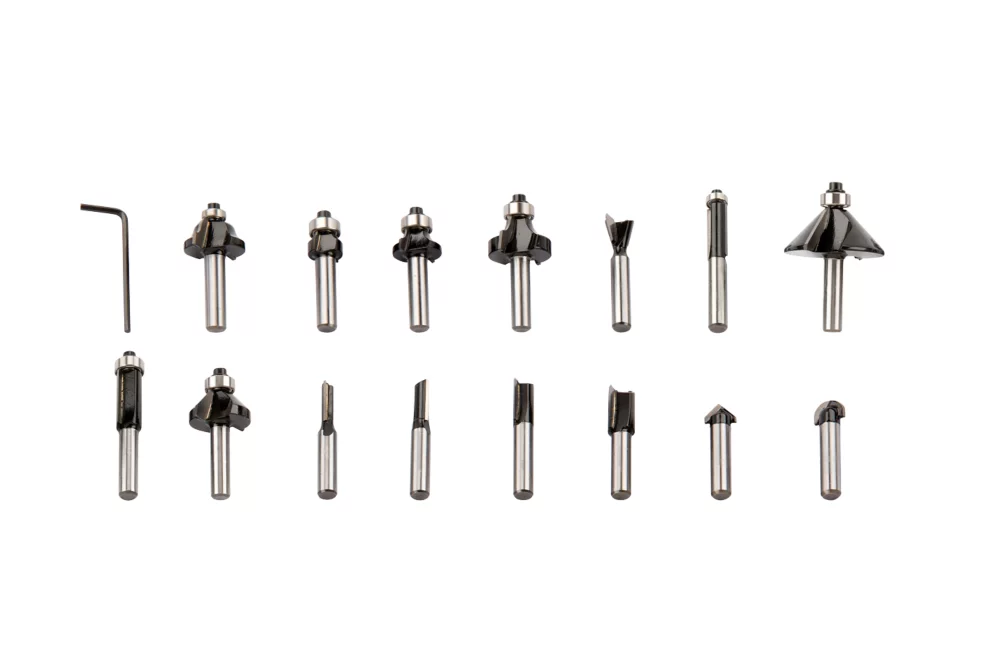 | Contenu | 2 fraises de découpe à ras (9,52 x 25,4 x 32mm et 12,7 x 25,4 x 32mm) avec 24 000tr/min, 1 chanfrein guidé 45° (28,6 x 13 x 32mm) avec 18 000tr/min, 1 chanfrein guidé 45° (44,5 x 18,5 x 32mm) avec 16 000tr/min, 1 fraise à doucine romaine (27 x 12,5 x 32mm) avec 18 000tr/min, 3 fraises d'arrondissement (16,7 x 8 x 32mm, 22,7 x 9,4 x 32mm et 28,7 x 16 x 32mm) avec 18 000tr/min, 1 fraise à queue d'aronde (14,3 x 12,5 x 32mm) avec 24 000tr/min, 1 fraise à rainurer en V 90° (27 x 9,5 x 32mm) avec 18 000tr/min, 4 fraises droites (6 x 20 x 32mm, 8 x 20 x 32mm, 10 x 20 x 32mm et 12 x 20 x 32mm) avec 24 000tr/min et 1 fraise à couronne (8 x 12,7mm) avec 24 000tr/min |