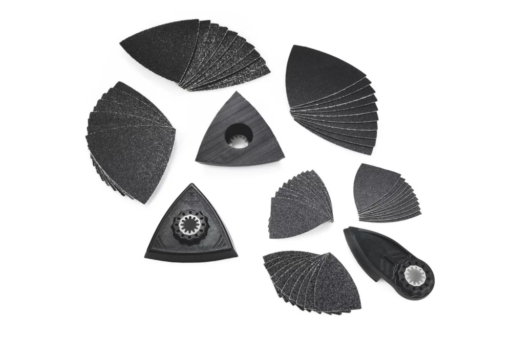 | Contenu | Patins de ponçage non perforés (80mm) (2), doigt de ponçage, feuilles abrasives (30) (grain 10 x 60, 10 x 80, 10 x 120). |