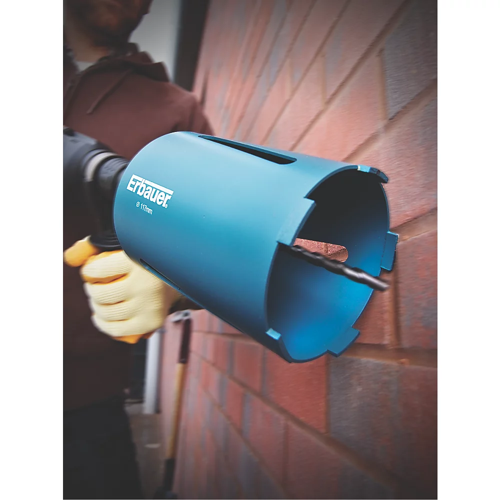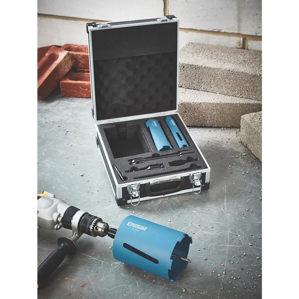 | Contenu | 3 trépans diamant (38, 52 et 117mm), rallonge de 200mm, adaptateur SDS de 115mm, adaptateur à 3 mors de 90mm, foret pilote (8 x 205mm) et chasse-outils de 75mm. |