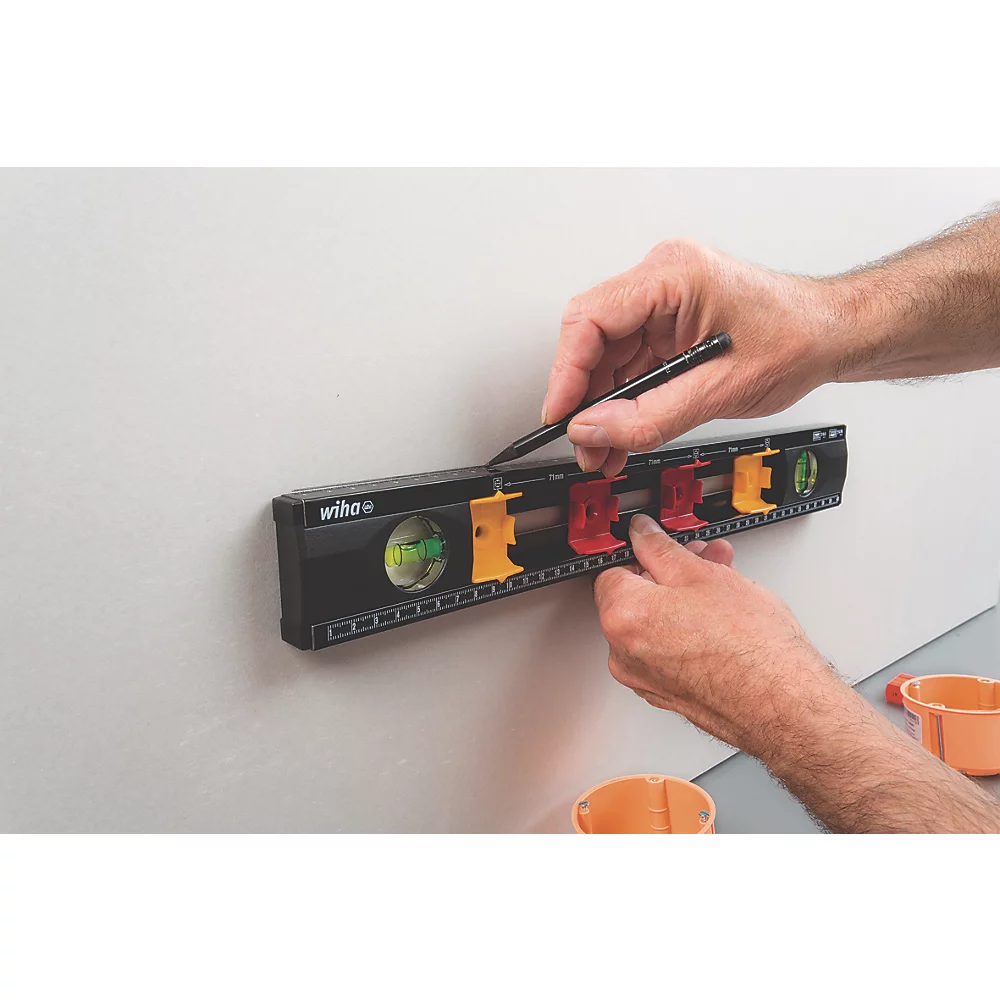 Les bulles sont parfaitement visibles, même depuis un angle aigu. Marquage de lignes sans devoir s’arrêter grâce au corps de bout en bout. Positions d’échelle linéaire pour mesurer de manière confortable, même en cas de vision par le dessus. Les repères de distance variables pour un maximum de 4 boîtiers de prise encastrés constituent un autre avantage pour les travaux d’installation électrique. Les points de marquage coulissants pour les boîtiers permettent de régler le niveau à bulle selon les distances de marquage requises par les réglementations locales. Peut être utilisé dans de très nombreuses situations, même au niveau international. Idéal pour un usage mobile et la mise en réserve.