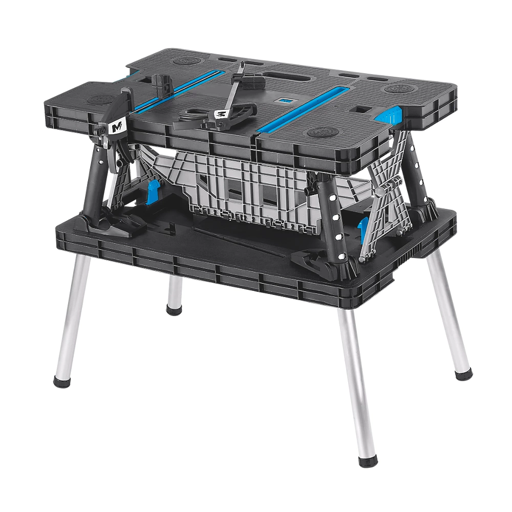 Poste de travail pliable portable avec système d’ouverture rapide. Doté d’une grande surface de travail et livré avec 2 serre-joints de 30cm.