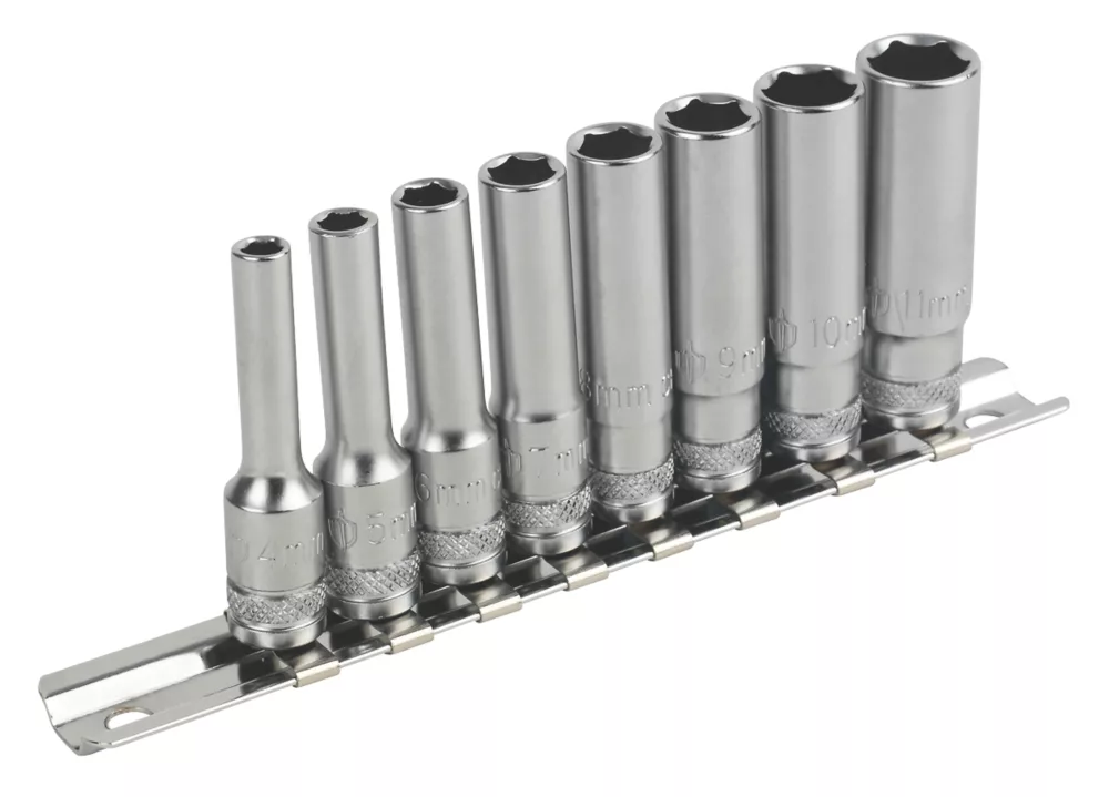 En acier à outils au chrome-vanadium trempé et meulé avec précision, pour une résistance et une durabilité accrues. Douilles moletées pour une meilleure prise en main et 6 points de contact. Rail fourni pour faciliter le rangement