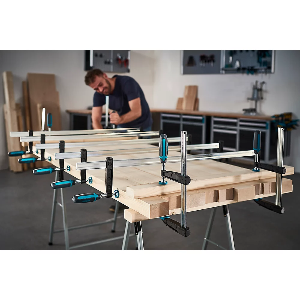 Transmission optimale de la force grâce à la poignée ergonomique avec revêtement antidérapant. Les surfaces de contact plates des bras de serrage permettent un positionnement sûr des pièces serrées. Particulièrement pratique pour le collage sans glissement ni desserrage accidentel. Les bords dentelés des deux côtés garantissent une stabilité de fixation d’une fiabilité absolue, même en cas de grandes ouvertures.