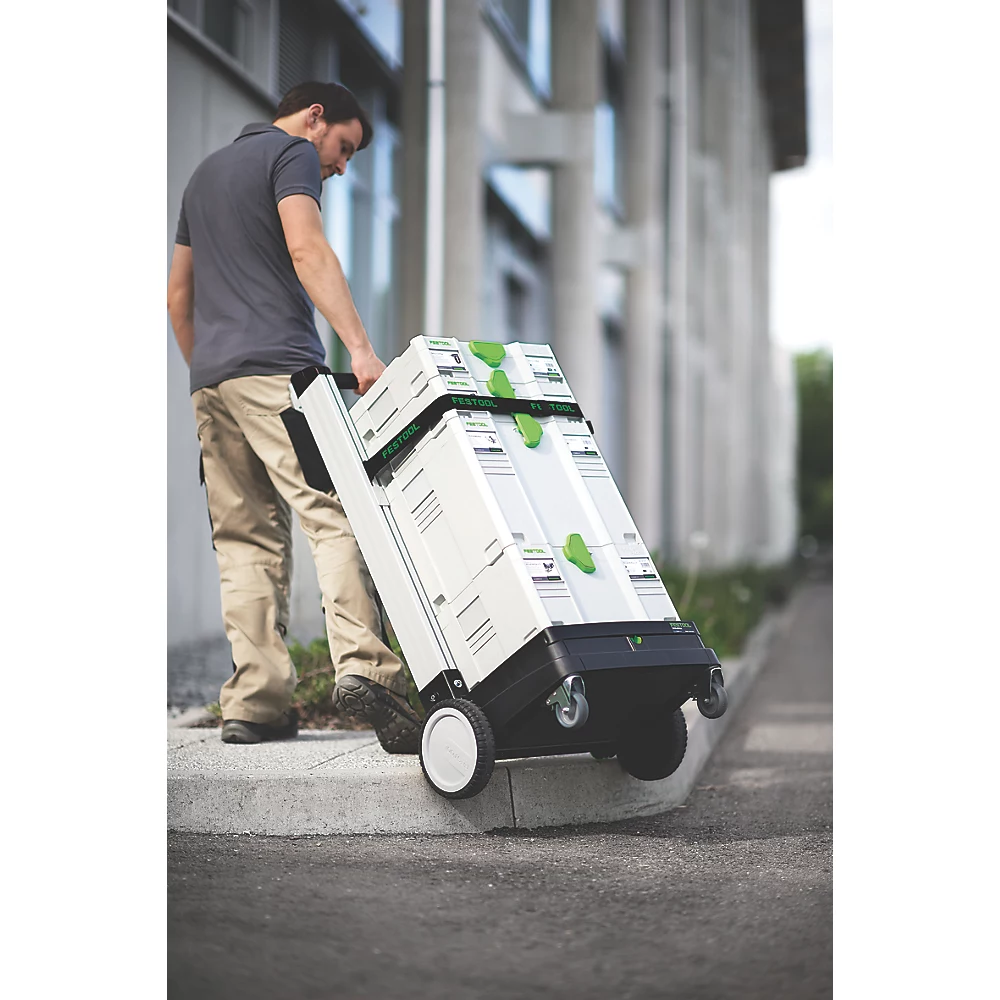Système de rangement et de transport d’outils léger, avec tiroir pour les accessoires et les petites pièces. Offre une solution simple et pratique pour transporter les systèmes Festool T-LOC et Systainer sur le chantier et en dehors. Non compatible avec les Systainers SYS-MINI, SYS-MIDI et SYS-MAXI. Fonctionne comme une brouette à sacs pour le chantier ou comme une planche à roulettes pour l’atelier. Les grandes roues arrière permettent de monter ou descendre facilement les marches, tandis que les roulettes avant permettent de manœuvrer dans toutes les directions.