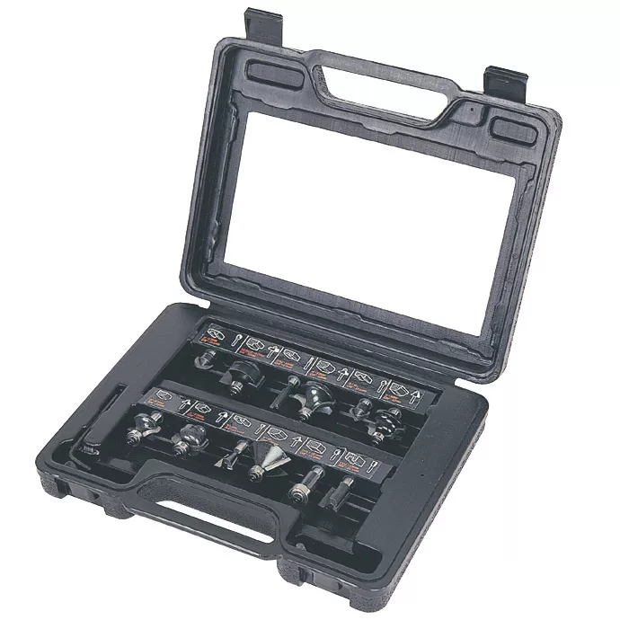 | Contenu | 2 goujures doubles (6,3 x 19, 12,7 x 19mm), queue d'aronde (12,7mm x 104°), 2 fraises à arrondir guidées (6,3 et 9,5mm), fraise à chanfreiner guidée (45°), fraise à feuillure guidée (9,5mm), fraise coupe-bordure affleurante guidée (12,7 x 12,7mm), fraise à gorge guidée (6,35mm), fraise à doucine romaine guidée (4mm), fraise à rainure en V (45°) et tête ronde 6,35mm. |