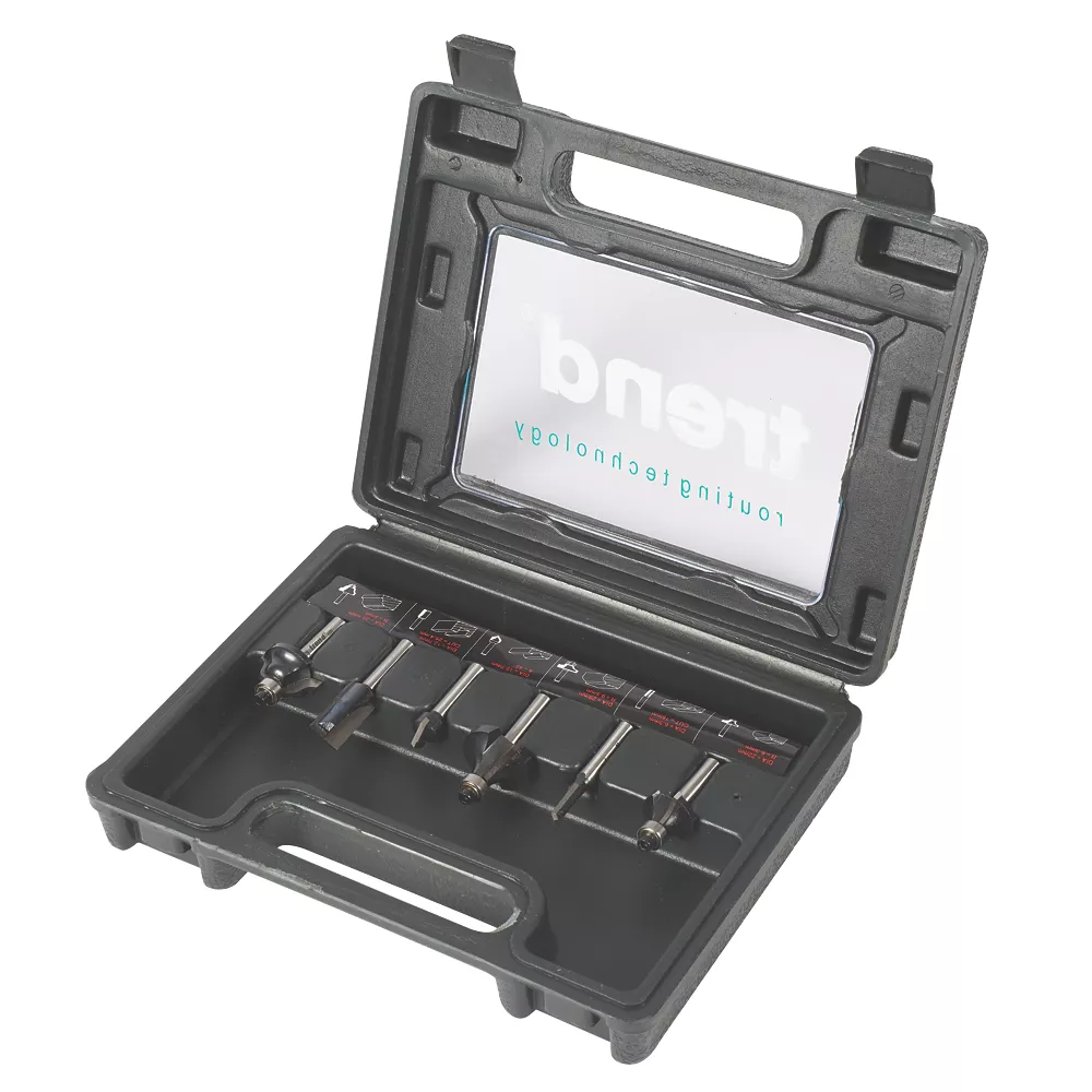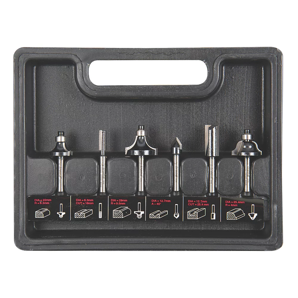 | Contenu | Fraise droite ¼", fraise droite ½", fraise à rainure en V, fraise à arrondir 6,35mm, fraise à arrondir 9,5mm et fraise à doucine 4mm. |